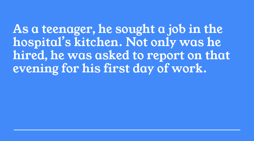 William fondly recalls those early days. As a teenager, he sought a job in the hospital’s kitchen. Not only was he hired, he was asked to report on that evening for his first day of work. From the start, he knew he had discovered a special place. Carrie McQueen, the person who hired him, wouldn’t let William start his job until he finished his homework and emptied the trash.