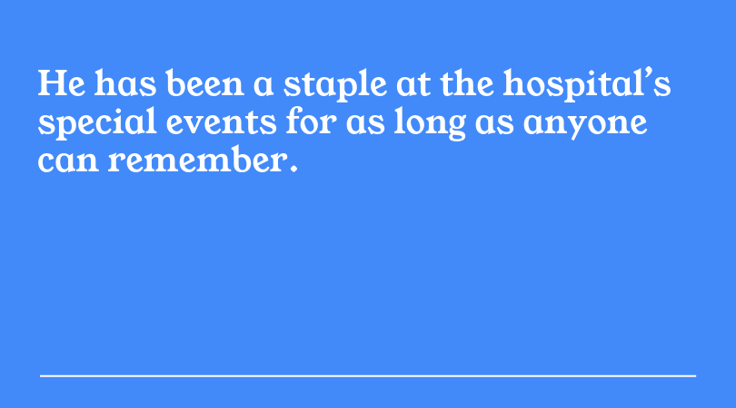 He has been a staple at the hospital’s special events for as long as anyone can remember, including employee meals and the annual hospital employees’ Alabama and Auburn football tailgate party in late November. William, an Alabama fan, screams “Roll Tide” throughout the entire football season.