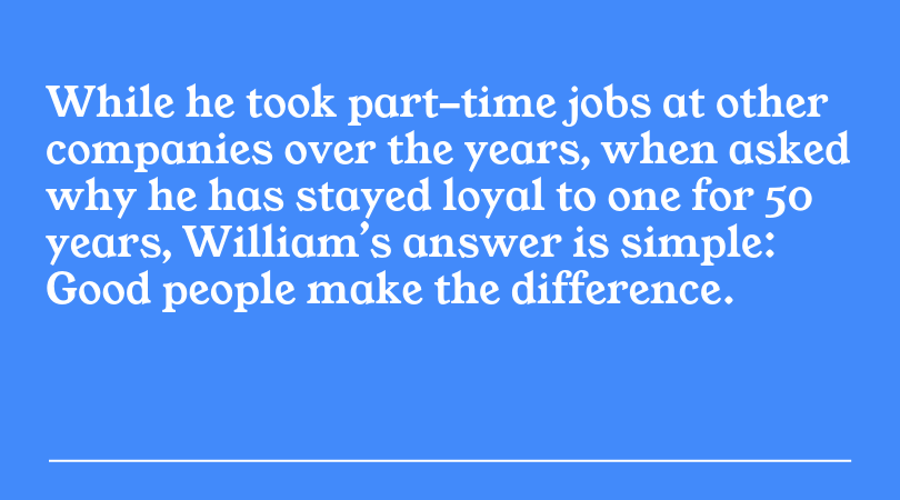 While he took part-time jobs at other companies over the years, when asked why he has stayed loyal to one for 50 years, William’s answer is simple: good people make the difference.