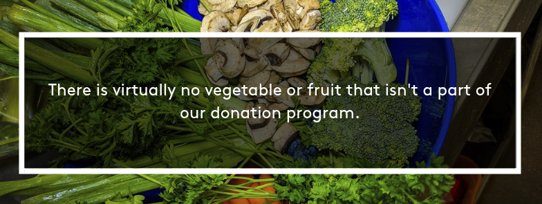 There is virtually no vegetable or fruit that isn’t a part of our donation program. The scraps range from onion peels, the tops of carrots and the cores of lettuce, kale, endive, and apples. We also provide bananas that are spotted or have broken cores; orange and pineapple peels; damaged berries and cucumbers, as well as the ends of squash and zucchinis. We prep, bag and separate all of the individual scraps and the college picks it up twice each week.