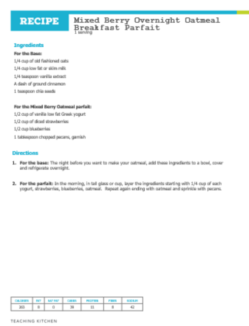 One of my favorite recipes from our Teaching Kitchen is Mixed Berry Overnight Oatmeal Breakfast Parfait. The oatmeal is a great source of fiber and blueberries provide the antioxidants. Chia seeds are a good source of omega 3 fatty acids while pecans are a healthy source of fat. Get out this summer, pick your berries and enjoy!