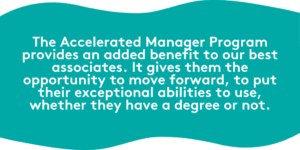 The Accelerated Manager Program provides an added benefit to our best associates. It gives them the opportunity to move forward, to put their exceptional abilities to use, whether they have a degree or not. We want them to advance as far as they can go. It’s not just getting paid a little more per hour, it’s moving forward in your career.