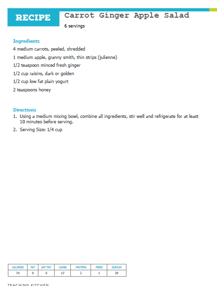 - Get creative with different chopping techniques. This recipe features grated carrots and thinly sliced apples. For different texture try chopping the carrots and apple and add some pistachios to jazz it up, this would pair well with a grilled chicken breast or fish.