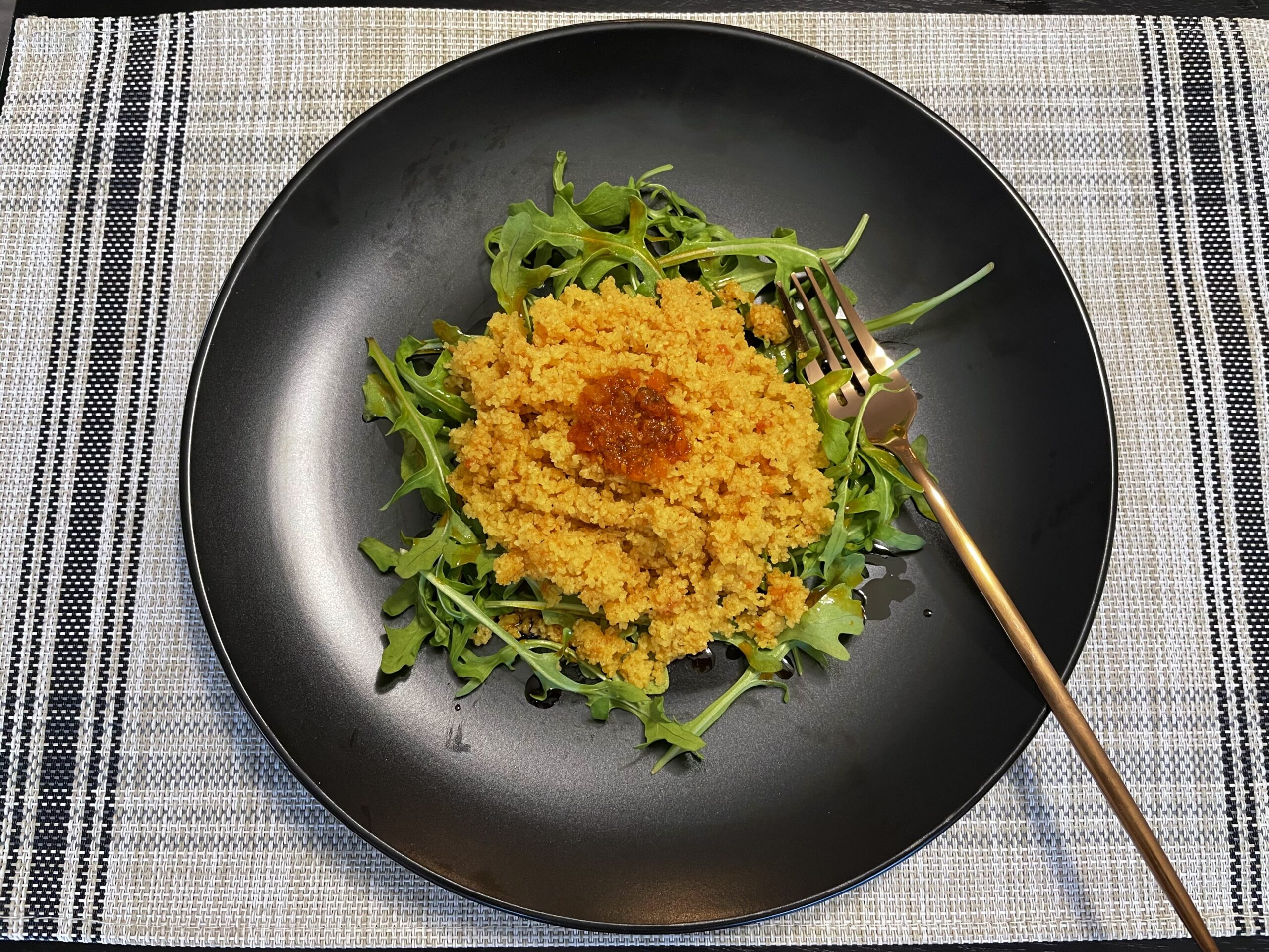 - To serve, scoop fonio atop a bed of arugula or any greens of your choice. Top with more stew and a side of fried plantains if desired and enjoy.