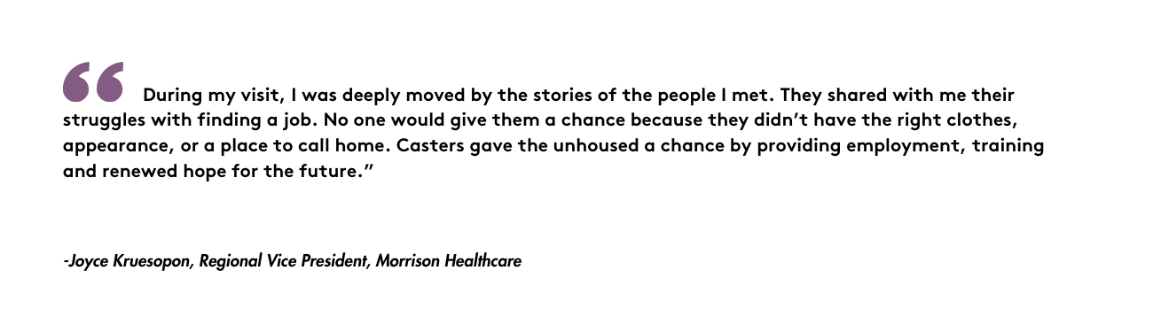 With Morrison as its first major client, Casters has grown with four full-time and two part-time employees. This partnership also allowed them to create a three-month job training program. It was the kickstart needed by the nonprofit dedicated to creating jobs for the homeless. Lee recalls his vision for getting a contract at the hospital as the key to his organization’s success.