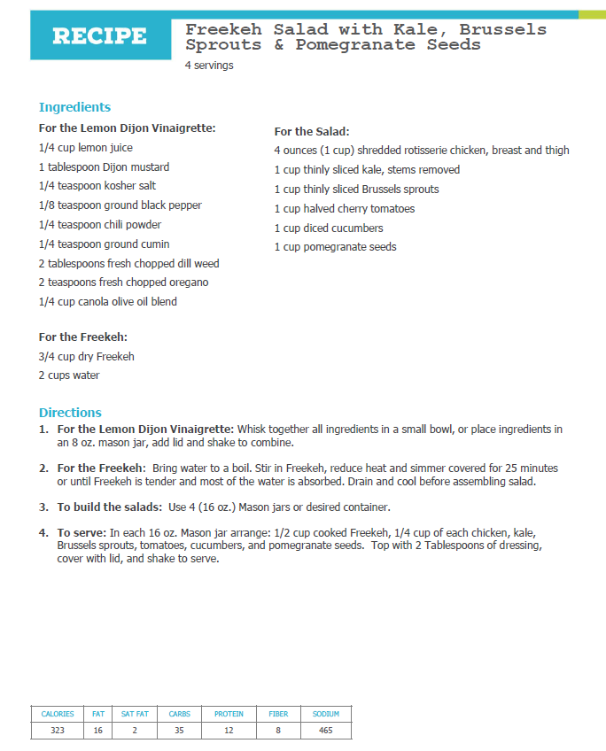 - To serve: In each 16 oz. Mason jar arrange 1/2 cup cooked Freekeh, 1/4 cup of each chicken, kale, Brussels sprouts, tomatoes, cucumbers, and pomegranate seeds. Top with 2 Tablespoons of dressing, cover with a lid and shake to serve.