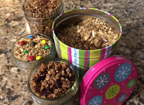 Granola makes a great gift during the holidays with recipe variations affording lots of options to bless the important people in your life. This is the perfect gift for teachers, co-workers, family and friends. You can pack the granola in decorative tins, mason jars or gift bags. Include a tag with these serving suggestions: Serve granola as a snack, use it in a yogurt parfait, add to your favorite chocolate chip cookie recipe or as a topping on frozen yogurt or ice cream.