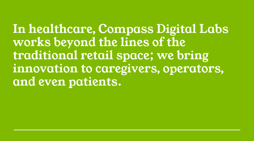 In healthcare, Compass Digital Labs works beyond the lines of the traditional retail space; we bring innovation to caregivers, operators, and even patients. Something as simple as wiring for a mobile project can be sent to a committee and take months for approvals. When you bring the complexity of privacy regulations into consideration; the entrance into this space can provide unique challenges.