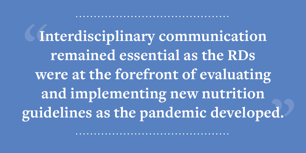 These changes also increased staff requirement in the clinical sector. Where a critical care RD would previously assess four or five critical patients on an average day, they were now assessing more than 10 daily. Interdisciplinary communication remained essential as the RDs were at the forefront of evaluating and implementing new nutrition guidelines as the pandemic developed.