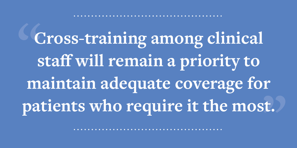Cross-training among clinical staff will remain a priority to maintain adequate coverage for patients who require it the most. The creative solutions implemented to obtain essential product during times of shortages will remain as a template. Beyond food supplies and supplements, communication of appropriate safety protocols, access to PPE and emotional support remains a priority to ensure the essential workers at the forefront are taken care of.
