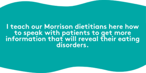 I teach our Morrison dietitians here how to speak with patients to get more information that will reveal their eating disorders. They won’t open up during a routine visit unless we ask more probing questions and become more empathetic.