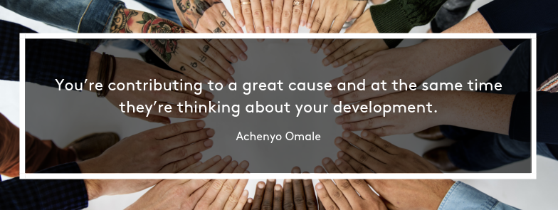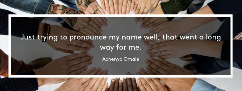 Having welcoming coworkers helps. Achenyo recalls seeing the muscles in her coworkers’ faces pulling as they tried to pronounce her name right. “They really wanted to connect with me. Just trying to pronounce my name well, that went a long way for me,” Achenyo says.