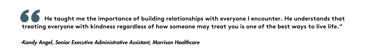 “The first week I started working for Joe, he came to Nashville and took me out to lunch,” said Kandy Angel, who has held the role as Joe’s senior executive administrative assistant for eight years. “I shared with him that my dad was suffering from an aggressive form of cancer, and I wasn’t sure how long he would survive. Joe didn’t ask; he demanded that I pack my things immediately and go see my father in North Carolina. I left that day. Little did I know this would be the last week for my dad. He passed the following week. Because of Joe’s true kindness and caring nature, I was able to spend my Dad’s last good week with him. I can never repay Joe for that gift.”