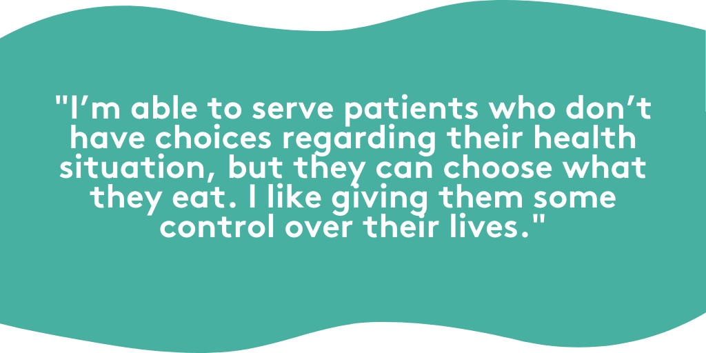 Kyria: A lot of things. I get to wake up every morning and come into work with a wonderful team. And I’m able to serve patients who don’t have choices regarding their health situation, but they can choose what they eat. I like giving them some control over their lives. I like to satisfy the patient. I like to accommodate their needs.