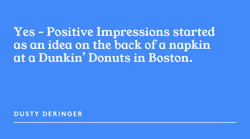 Dusty: Yes – Positive Impressions started as an idea on the back of a napkin at a Dunkin’ Donuts in Boston. Lauren Prepchuk has since transitioned roles, but she was a part of our Patient Experience team at the time. Together, we sketched out a concept.
