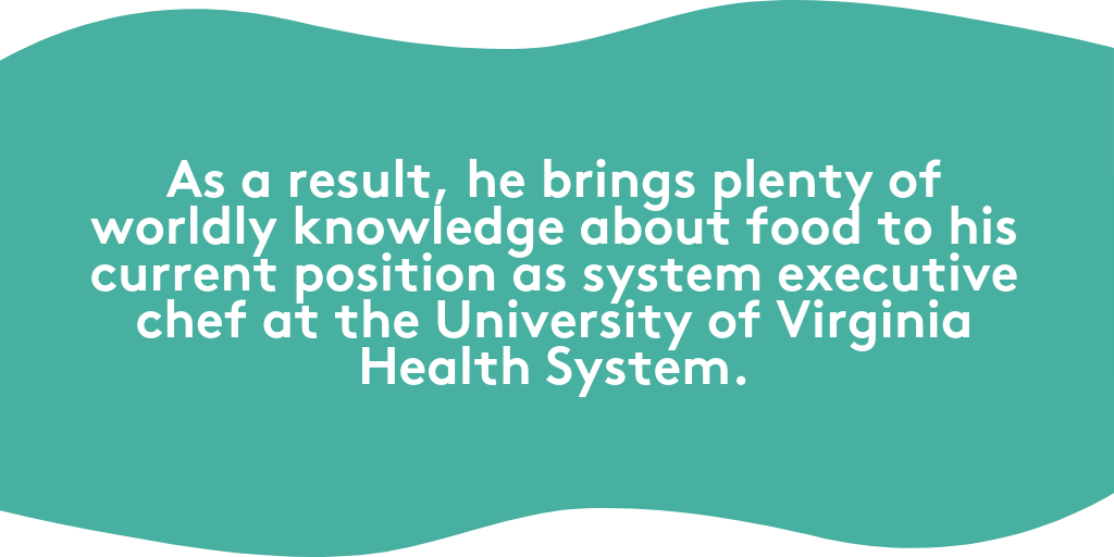 Chef Watton travels far and wide on his vacations; he’s also visited Cambodia, Hong Kong, Egypt and Switzerland. As a result, he brings plenty of worldly knowledge about food to his current position as system executive chef at the University of Virginia Health System. In this position since January 2018, Watton oversees preparation and cooking for all food in the hospital’s café, patient dining, and on and offsite catering.