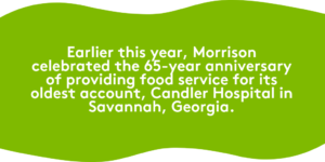 Earlier this year, Morrison celebrated the 65th anniversary of providing food service for its oldest account, Candler Hospital in Savannah, Georgia. Built in 1804, it was Georgia’s first hospital and is the second oldest continuously operating hospital in the U.S.