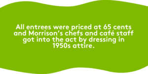 The celebration’s 65-year theme continued the next day with a variety of events in the hospital’s café. All entrees were priced at 65 cents and Morrison’s chefs and café staff got into the act by dressing in 1950s attire. Some, for example, wore soda jerk caps and uniforms and served old school ice cream sundaes in classic milkshake glasses.