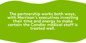 The partnership works both ways, with Morrison’s executives investing their time and energy to make certain the Candler medical staff is treated well.  For example, approximately one year ago, Miller organized a focus group of hospital nurses to meet monthly to determine how Morrison could better meet their needs.