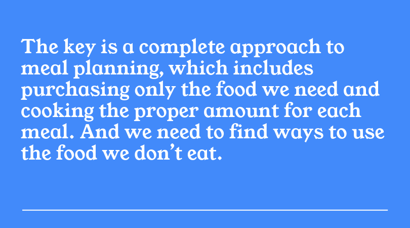 A key is a complete approach to meal planning, which includes purchasing only the food we need and cooking the proper amount for each meal. And we need to find ways to use the food we don’t eat.