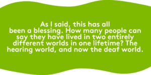 It took me a little while to adjust from my hearing world to this unfamiliar one, of being deaf. I had to learn sign language and learn to deal with my own frustrations and how to cope in this new world. My eyes became my ears, and my patience changed, both for myself and for others. I saw different cultures and different language barriers as something I could now relate. Something I had no experience with before I’d lost my hearing.