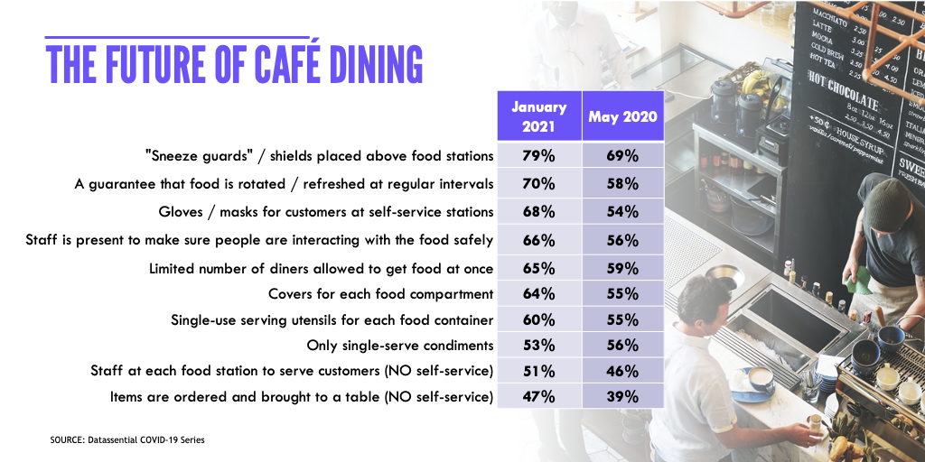 The safety procedures that consumers are most likely to consider a requirement when choosing a restaurant are visible cleaning of high-touch surfaces, employees wearing safety gear, and food coverings. This kind of vigilance about sanitation will remain in a post-pandemic world.