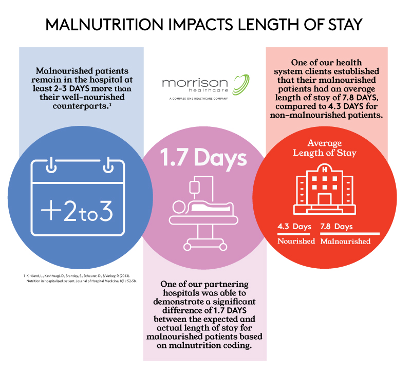 Fiscal Year 2018 (VA+ SC): $1,333,073 - Better patient outcomes. Patients with protein-calorie malnutrition remain in the hospital on average 5.8 days more than their well-nourished counterparts. Hospital costs associated with malnutrition are related to the average length of stay. Medicare establishes the expected average length of stay based on the final Medicare Severity-Diagnosis Related Group (MS-DRG), a system used to classify a patient’s hospital stay into various groups to facilitate payment of services.When malnutrition is identified, coded, and treated appropriately, the assigned MS-DRG may change, indicating a longer expected length of stay that more accurately reflects the resources needed to care for malnourished patients.